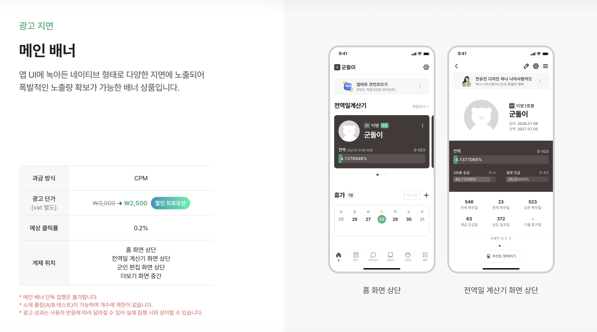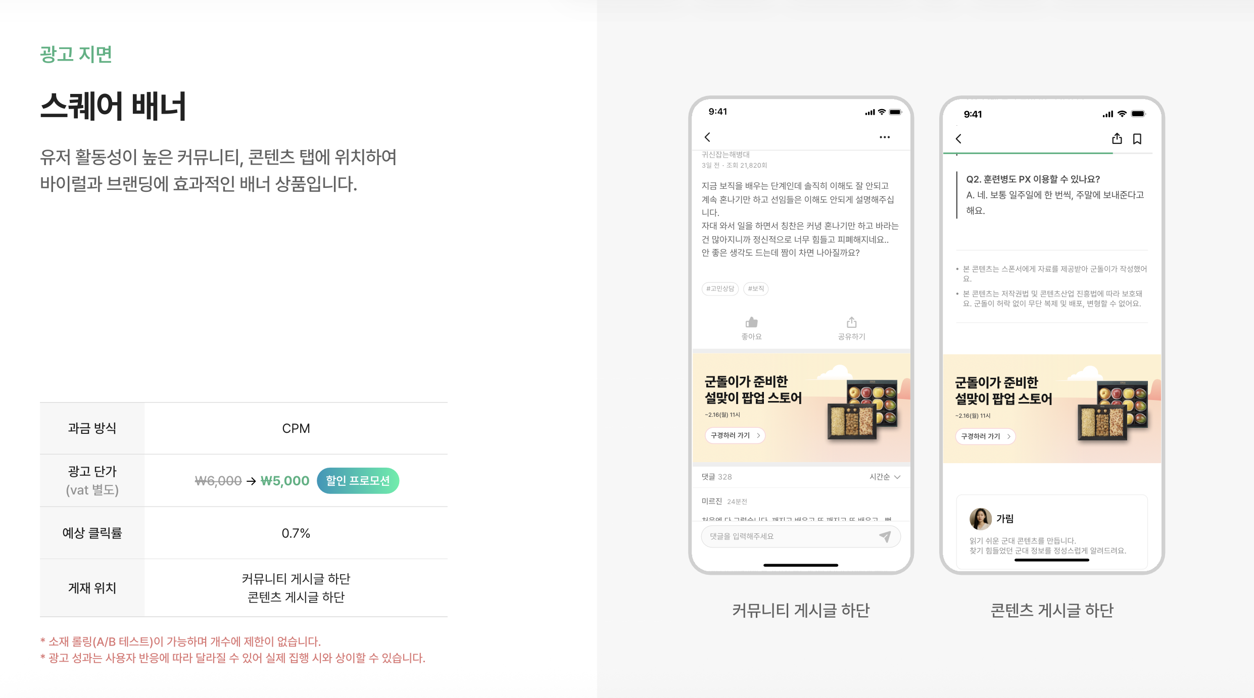 - 유저 활동성이 높은 커뮤니티, 콘텐츠 탭에 노출되는 배너 광고 상품