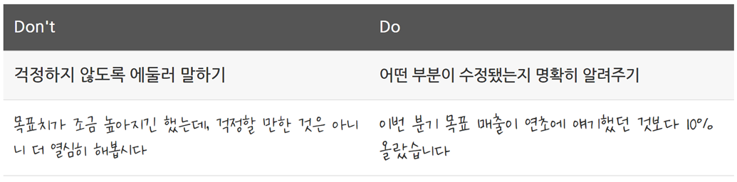 명확성이 중요하니 ‘이번 분기 목표 매출이 10% 올랐다.’라고만 하면 될까요? 명확하긴 하지만 좀 아쉽죠. ‘왜’ 그렇게 됐는지에 대한 설명이 없기 때문입니다. 외부 시장 변화로 인해 좀 더 공격적 영업이 필요한 상황일 수도 있고, 내부 재고 이슈를 해결하고자 매출을 올리려는 것일 수도 있겠죠. 어떤 상황이든 그 이유에 대해 구체적으로 밝혀주셔야 상황에 대한 구성원들의 이해도 높아지고, 그 이유와 목적에 맞는 방향으로 업무를 실행할 수 있을 것입니다.