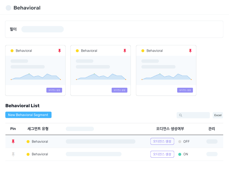 · 고객 속성, 고객 행동 데이터 기준으로 정교한 타겟팅이 가능합니다. AI기반으로 고객 세분화 데이터를 통해 고객 맞춤 상품 및 컨텐츠를 제공하여 고객들의 니즈를 충족시킬 수 있습니다.