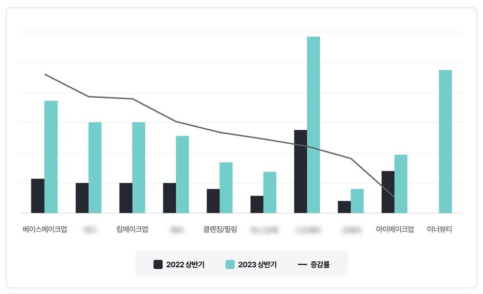 23년 2월 화해 웨비나에서 전망했던 ‘Return of Makeup’의 영향으로 ‘베이스메이크업’과 ‘립메이크업’ 카테고리가 급증하였고, 상대적으로 코로나의 영향을 적게 받았던 ‘아이메이크업’은 가장 낮은 증감률을 보입니다. 색조의 상승으로 ‘클렌징/필링’도 동반 상승한 것으로 보입니다. 이 외에 어떤 카테고리가 증가했는지 확인해 보세요. :)