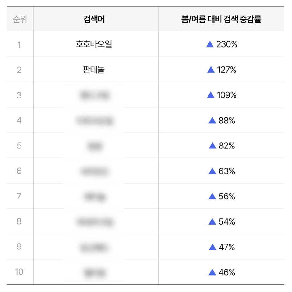 가을/겨울(22.09~23.02)에 검색량이 급증한 검색어는 ‘호호바오일’과 ‘판테놀’입니다. 그 외의 급상승 키워드도 주로 보습, 재생과 관련된 단어이며, 여름에 손상된 피부 회복을 위한 성분인 오일과 크림에 대한 검색어도 급증하는 경향을 보입니다. 이 외에 가을/겨울 검색이 많이 된 키워드, 봄/여름에는 검색 상위 순위에 없다가 가을/겨울 새롭게 등장한 키워드는 무엇일지 궁금하시다면 전체 리포트를 통해 확인해 보세요!