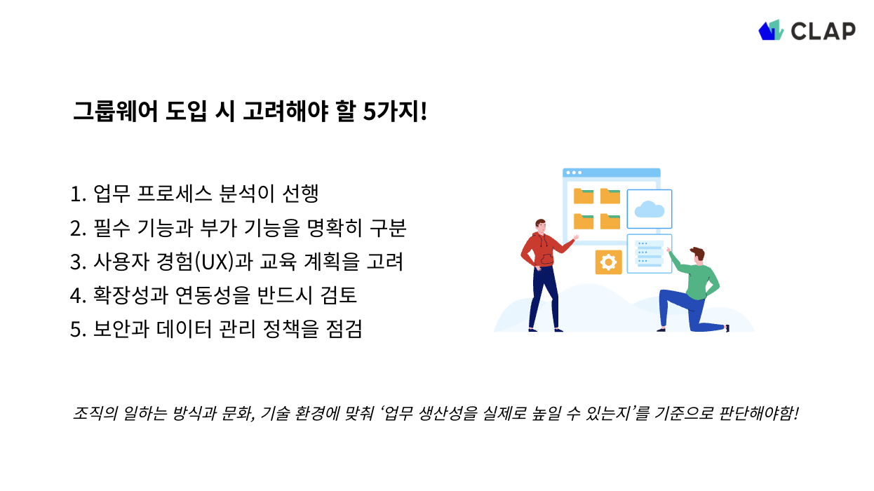 이 글의 원문은 CLAP팀 블로그 왜 지금 ‘그룹웨어’가 다시 주목받는가 에서 확인할 수 있습니다.