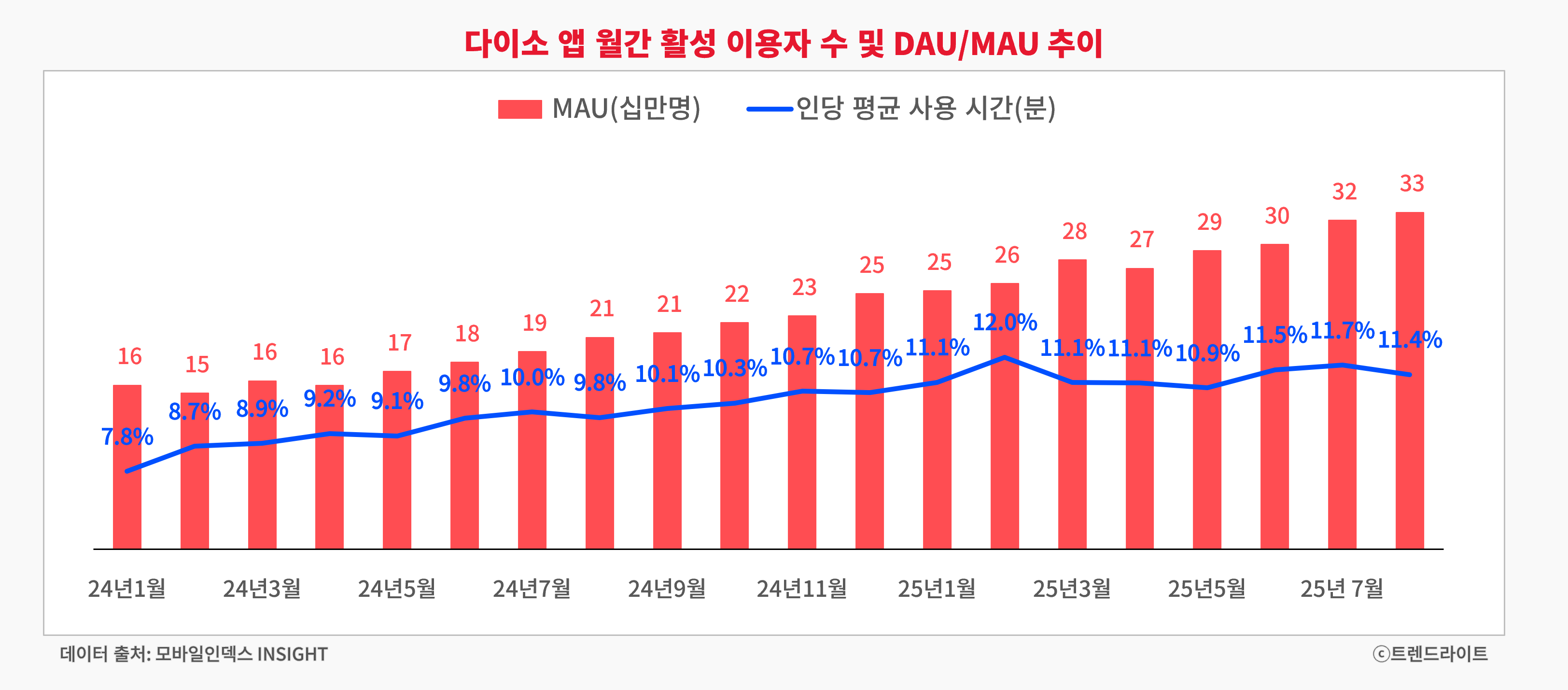 문제는 방문 빈도가 따라오지 않는다는 점입니다. 고착도 지표인 DAU/MAU가 올해 들어 줄곧 보합세를 보이면서, 트래픽 규모는 커졌지만 체류·재방문 품질이 개선됐다고 보긴 어렵습니다.