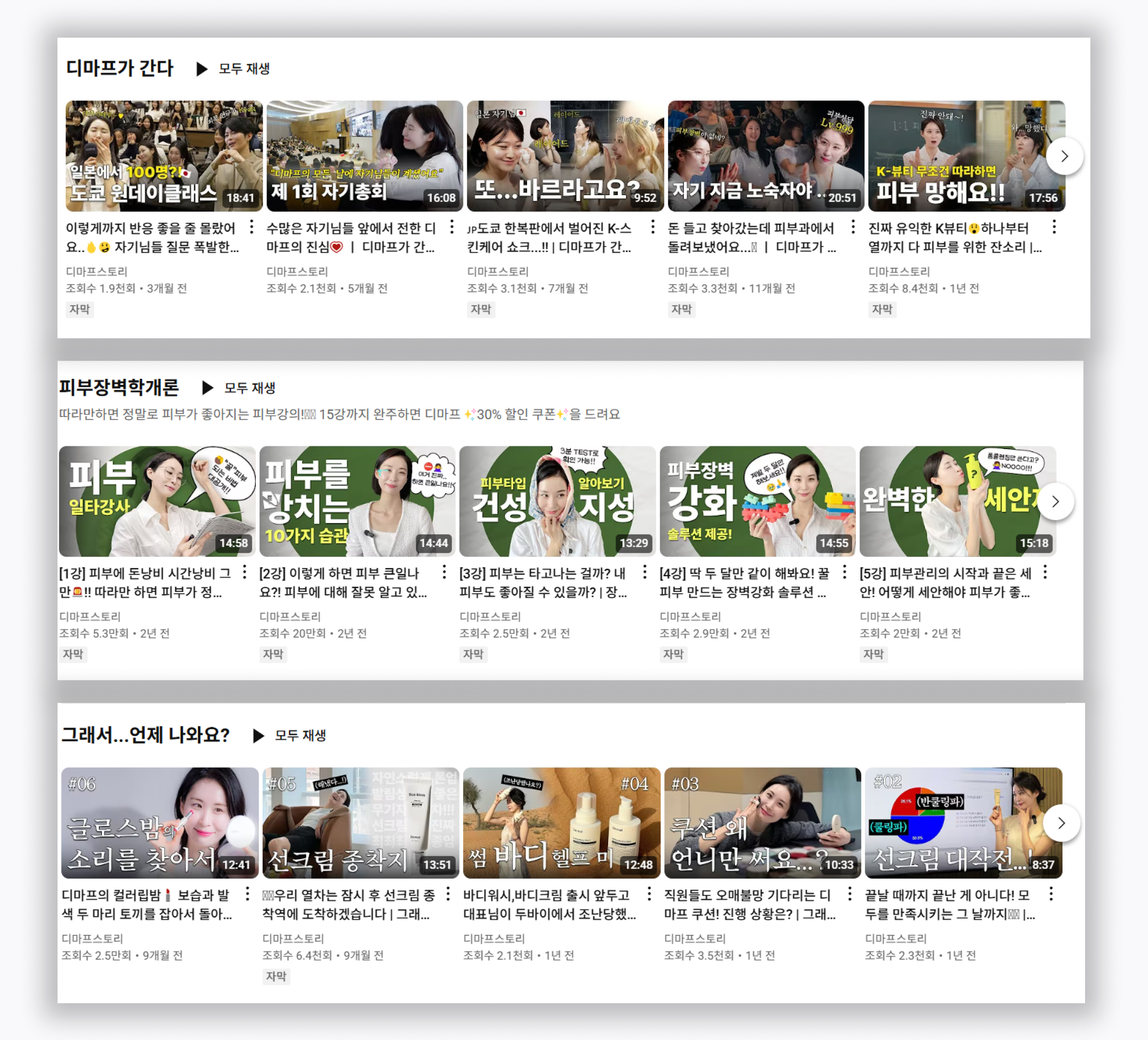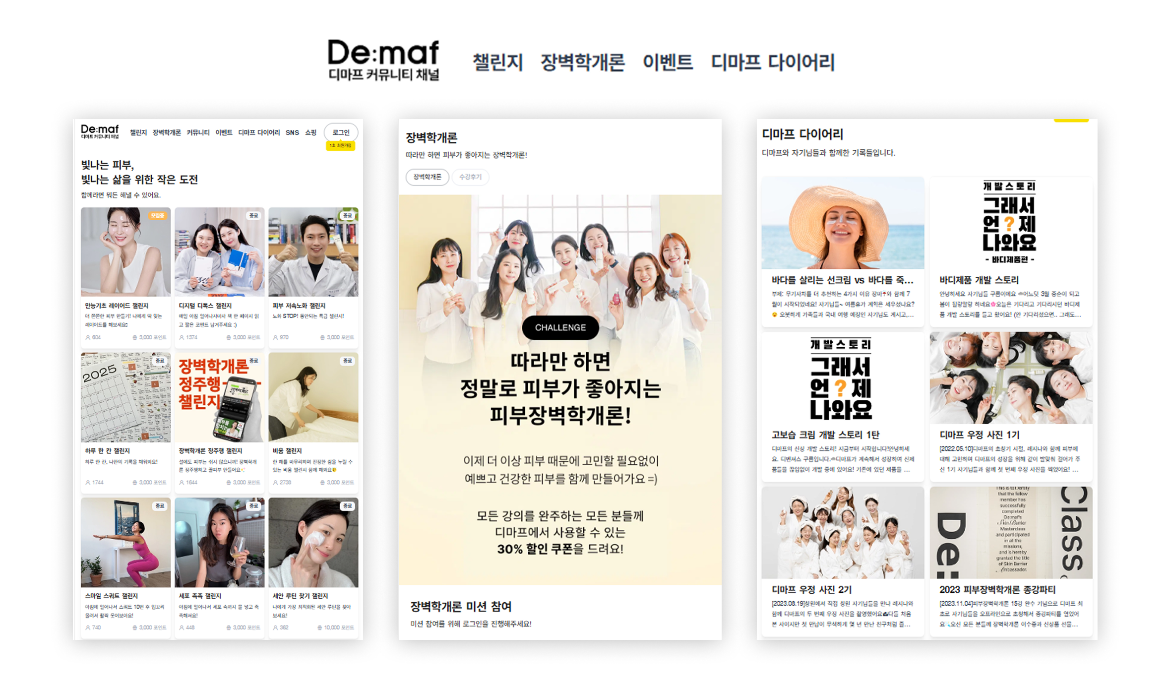 디마프는 자체 콘텐츠를 통해 마케팅을 하고 있는데요. 인스타, 유튜브 등의 채널을 활발하게 이용하고 있습니다. 특히 피부 장벽에 대한 기초부터 실천 방법까지 알려주는 입문 강의 콘텐츠 ‘피부 장벽학개론’이 큰 인기를 끌었어요. 매주 하나씩 강의를 보고, 미션을 수행하는 챌린지 형식으로 진행되었고 실제로 피부에 변화를 느낀 고객들의 커뮤니티가 형성되기도 했죠. 친구처럼 함께 피부를 돌봐주는 경험이 브랜드의 정체성으로 자리잡으며 소비자들에게 브랜드에 대한 긍정적인 인식과 신뢰도를 가지게 한 거예요.