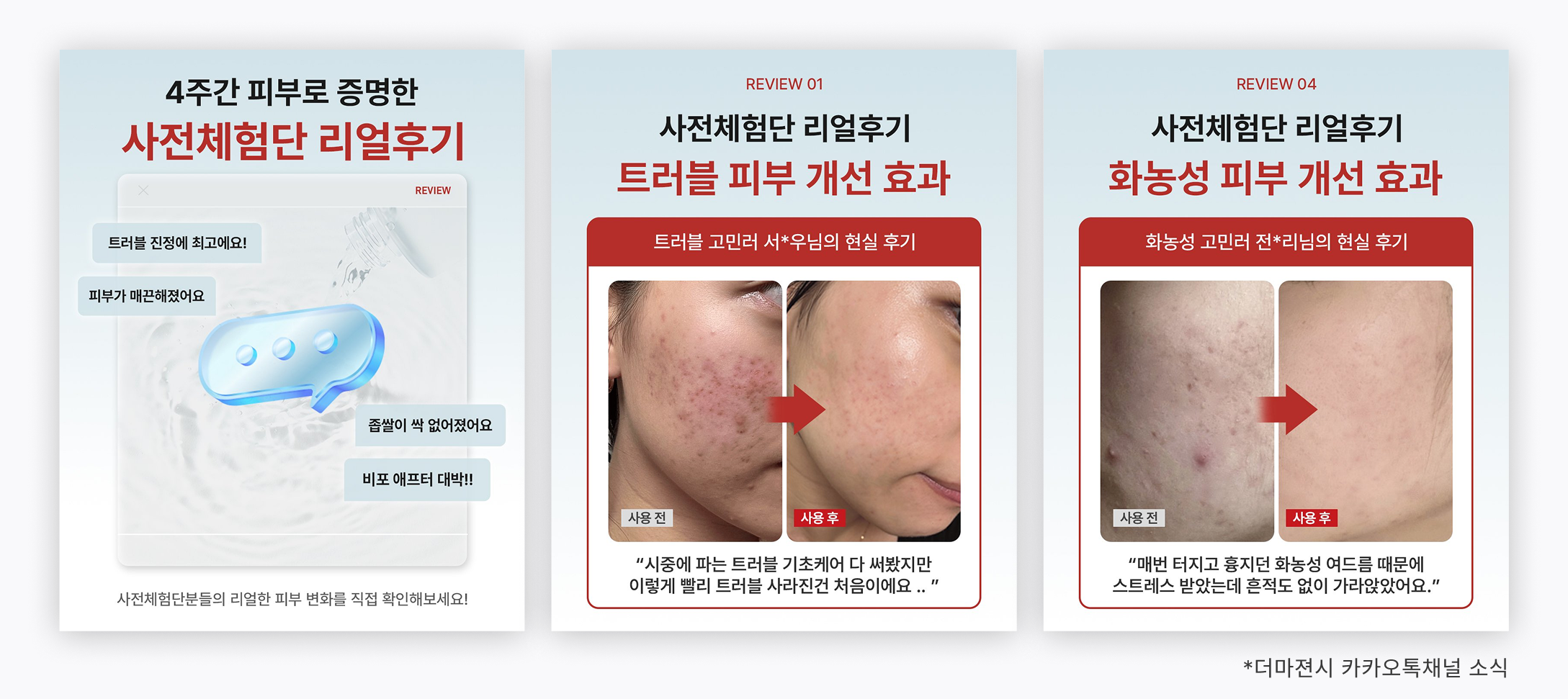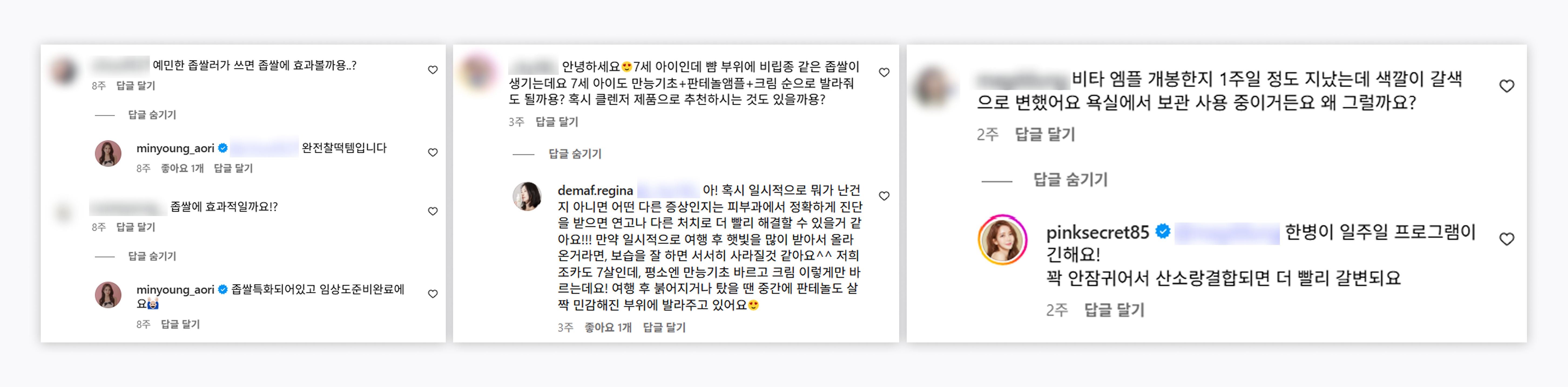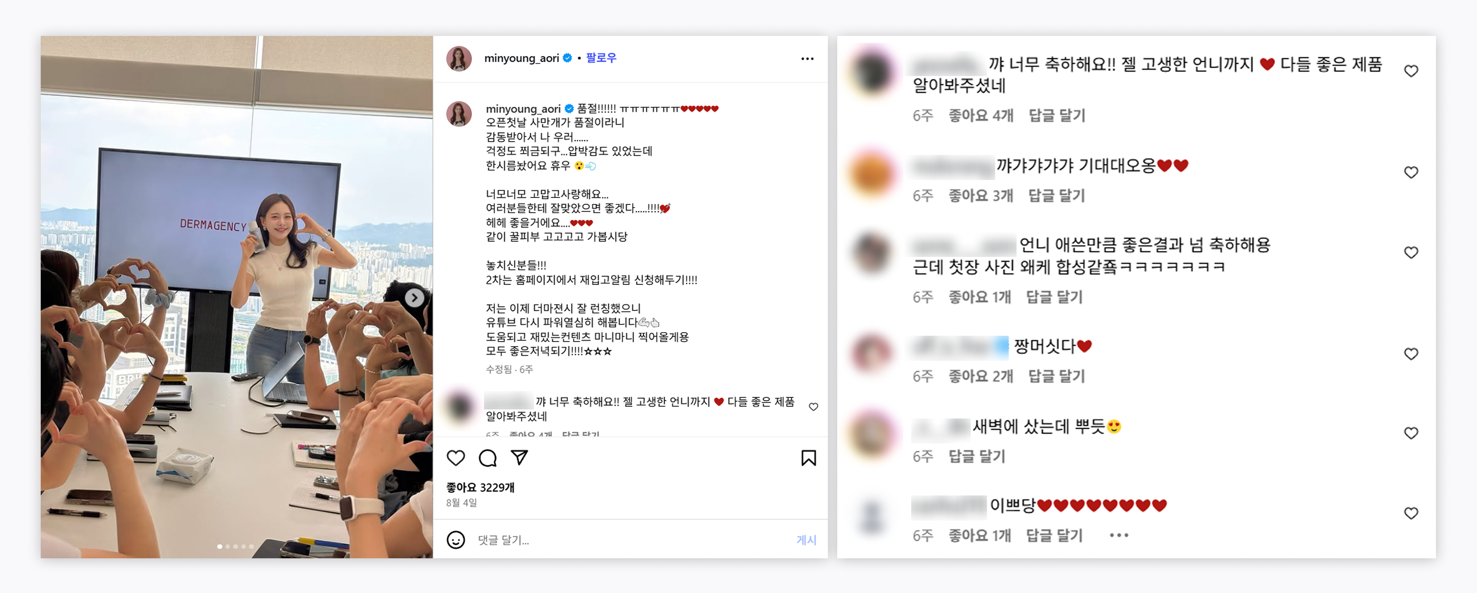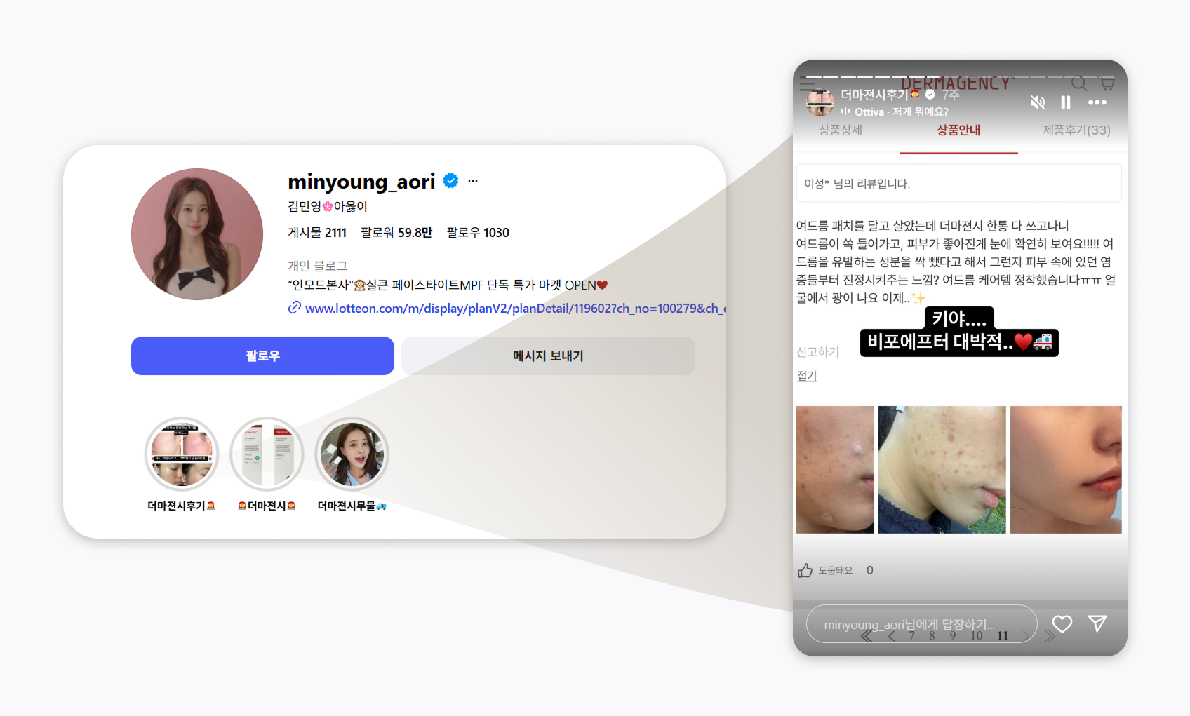 더마젼시는 제품 출시 전 문제성 피부를 가진 사람들이 직접 사용해보고 후기를 공유하는 사전체험단을 운영했습니다. 사전체험단은 4주간 더마젼시 제로카 라인을 사용하며 긍정적인 변화를 경험한 후기를 남겼으며, @minyoung_aori 인스타 계정에 체험단 후기를 기반한 스토리와 게시물을 올리는 등 인플루언서의 인지도를 이용한 마케팅도 함께 진행하고 있어요.
