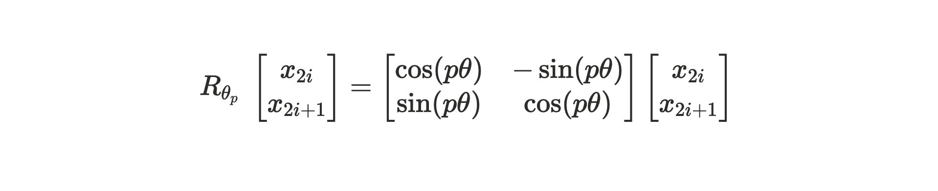 RoPE의 핵심 수식: 토큰 임베딩에 위치 p에 따른 회전 행렬을 적용해, 내적 계산 속에 상대적 거리 정보를 주입합니다.