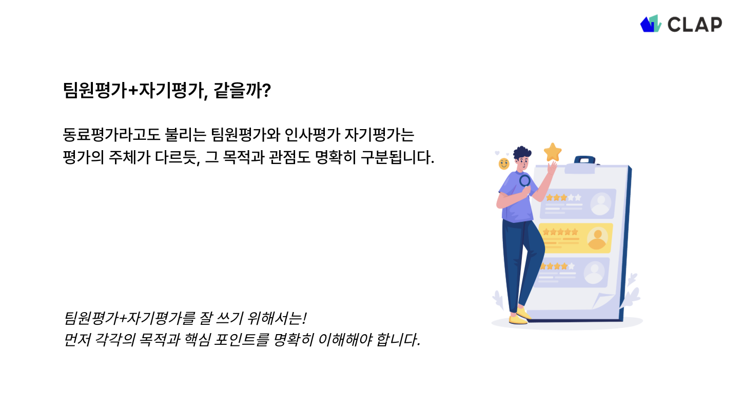 이 글의 원문은 CLAP팀 블로그 팀원평가+자기평가 제대로 쓰는 법: 인사평가 작성 예시 총정리 에서 확인할 수 있습니다.