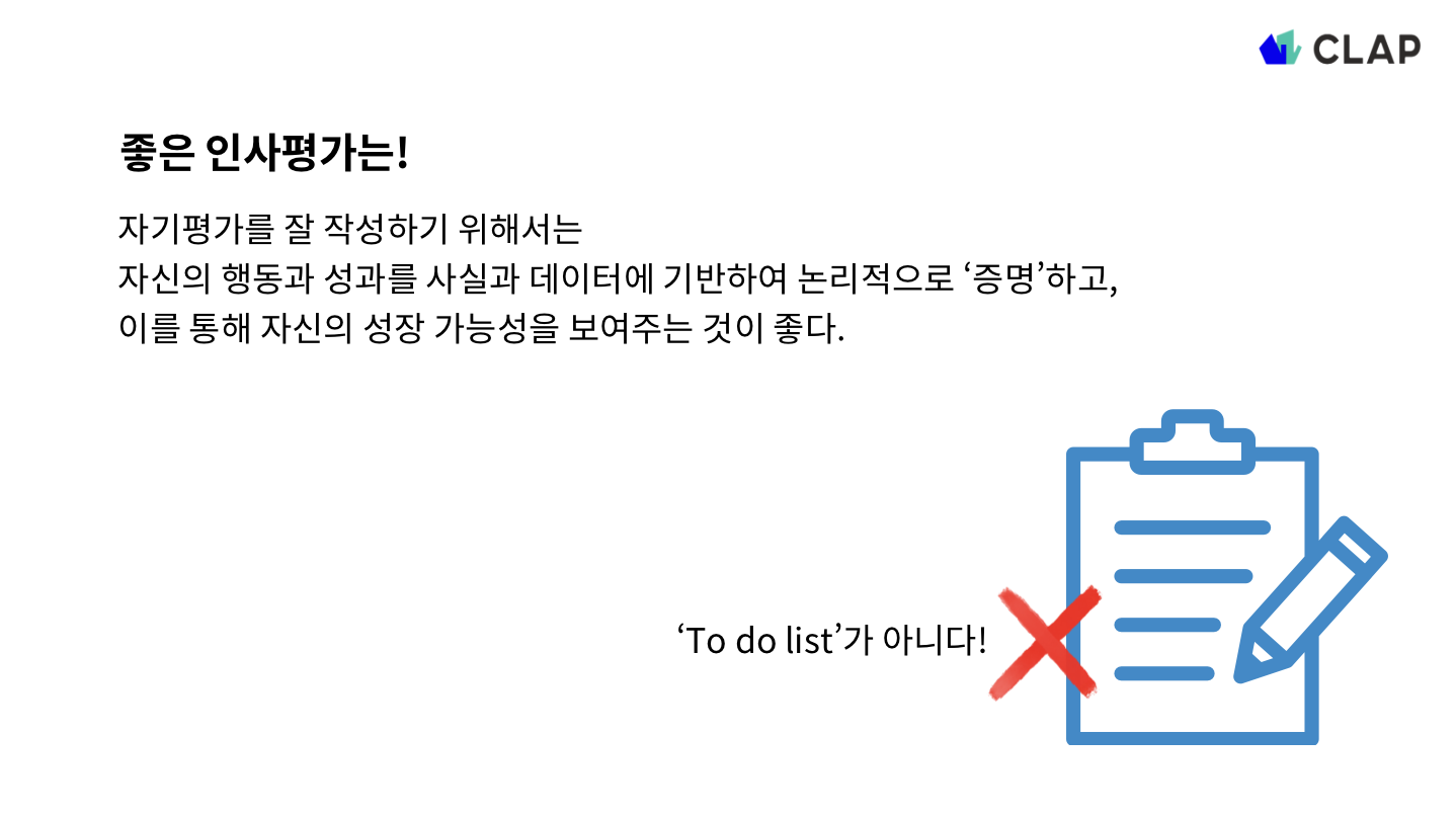 좋은 인사평가 자기평가는 단순히 지난 업무를 나열하는 ‘To do list’가 되어서는 안됩니다. 자신의 성과를 부풀리는 ‘자기 자랑’은 더더욱 아닙니다. 자기평가를 잘 작성하기 위해서는 자신의 행동과 성과를 사실과 데이터에 기반하여 논리적으로 ‘증명’하고, 이를 통해 자신의 성장 가능성을 보여주는 것이 좋습니다.