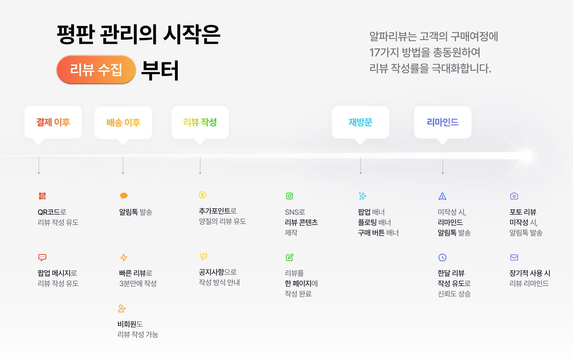 위 이미지를 보면, 개별 기능이 한꺼번에 생긴 게 아니라는 것을 아실 수 있을 겁니다. 알파리뷰는 고객이 언제, 어떻게 리뷰를 남길 수 있을지 고객의 구매 여정에 기반해서 필요한 기능들을 계속해서 만들어왔는데요.