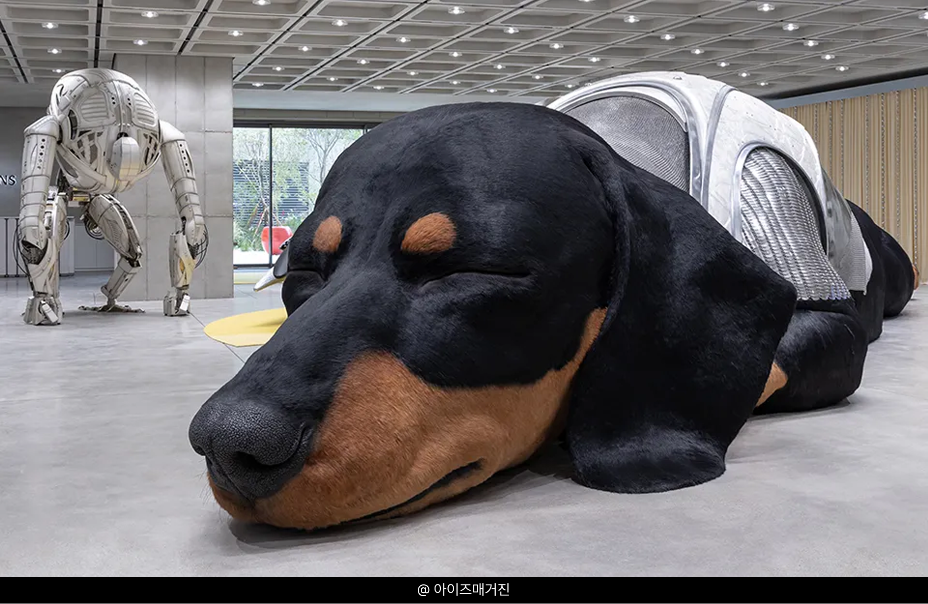 하루에도 몇 번씩 피드에 등장하는 이 강아지가 제 호기심을 자극해 결국 직접 찾아가 봤는데요. 막상 들어가 보니 뭔가 이상하더라고요. 분명 소개 글에서는 아이아이컴바인드의 여러 브랜드를 한곳에서 만날 수 있는 리테일 공간이라고 했는데, 제품이 진열된 매대는 잘 눈에 띄지 않고 마치 미술관에 온 것처럼 내부가 온통 예술 작품들로 채워져 있는 거예요.