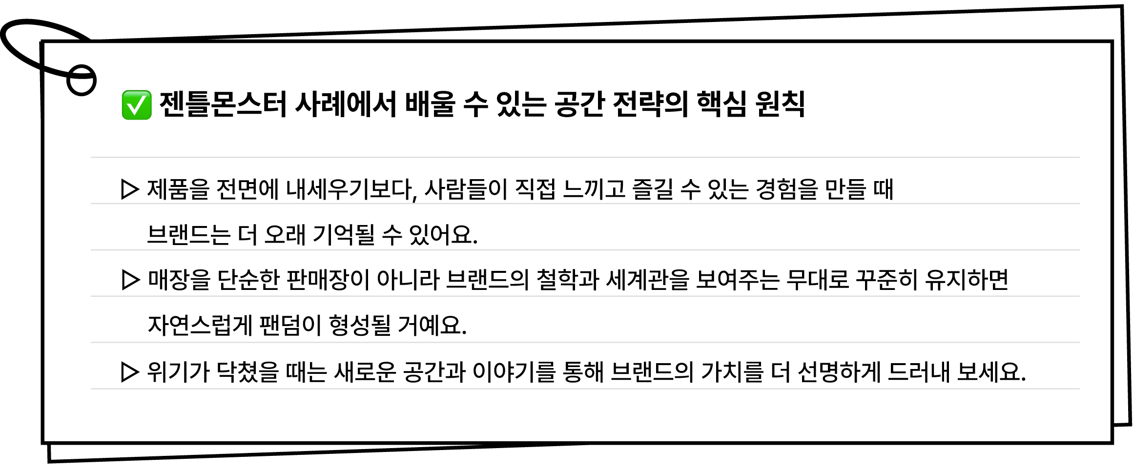 그래서 오늘 레터에서는 젠틀몬스터가 어떤 오프라인 전략으로 성장해 왔는지 단계별로 따라가 보려고 합니다. 젠틀몬스터의 전략을 꼼꼼히 들여다보면, 님의 브랜드가 앞으로 오프라인 공간을 어떻게 활용할 수 있을지 영감을 얻을 수 있을 거예요👀