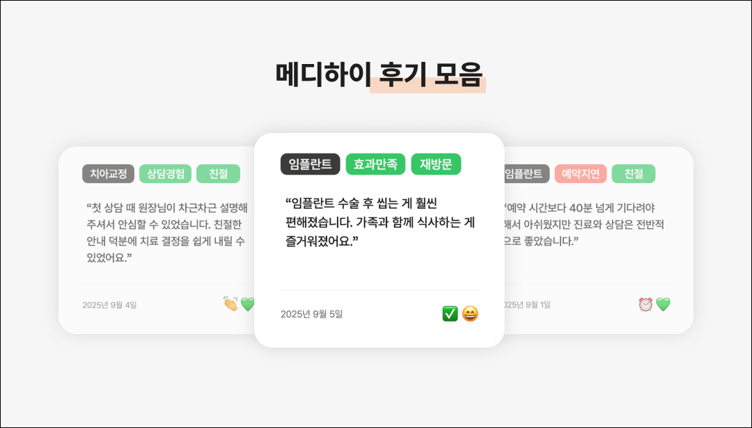 병원 선택 | 진솔한 후기 & 맞춤형 추천: 실제 경험자들의 후기와 개인 조건에 맞는 추천을 통해 환자가 병원 선택에 확신을 갖도록 합니다. |