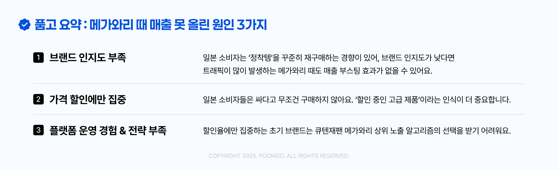 특히 일본 시장 입점 초기 브랜드라면, 낮은 브랜드 인지도가 메가와리에서 매출 부스팅을 받지 못한 주요 원인일 수 있습니다. 메가와리는 트래픽이 급증하는 시기이지만, 기존에 워낙 인기 있던 브랜드들에 비해 인지도가 낮으면 애초에 고객들의 눈에 띄기조차 어렵기 때문이에요.