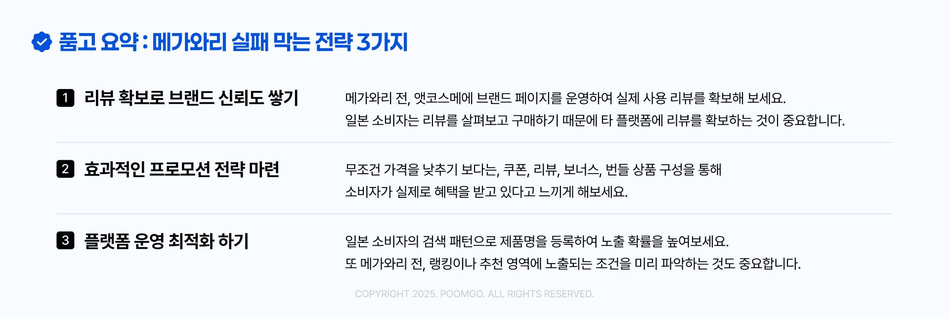 메가와리는 여전히 K-브랜드에게 엄청난 기회입니다. 평소보다 트래픽이 수십 배 이상 증가하며, 일본 소비자에게 우리 브랜드를 확실히 증명할 수 있는 무대가 되어주죠. 만약 이번 메가와리에서 아쉬움이 남았다면, 그만큼 다음 기회에 훨씬 더 크게 성장할 여지가 있다는 뜻이기도 합니다!