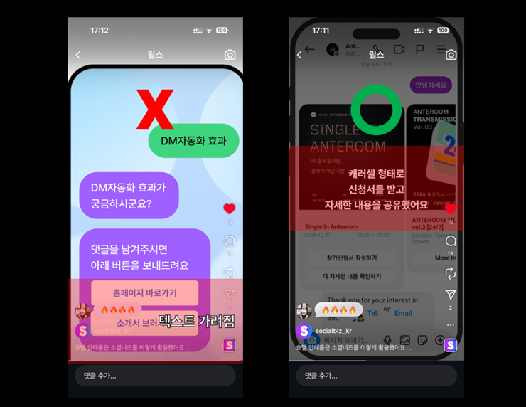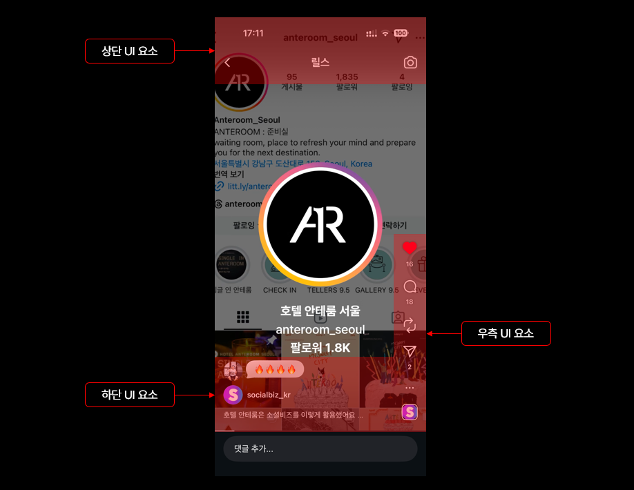 많은 분들이 릴스를 전체 화면으로 생각하지만, 실제로는 UI 요소에 일부가 가려지는 구조예요. 화면 위에는 계정명, 좋아요·댓글 아이콘, 캡션, 음악 정보 등이 오버레이 되어 텍스트가 겹쳐 보이는 경우가 많아요.