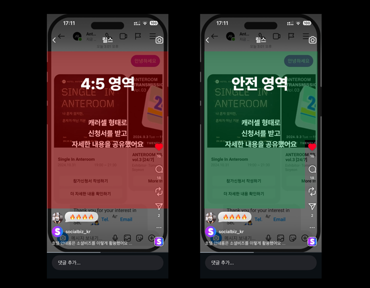 - ✔ 인스타그램 릴스, 이제는 UI까지 고려하는 사이즈 기획이 필요해요! ✔ 4:5 비율, 안전 영역에 핵심 내용을 담아 보세요! ✔ 소셜비즈가 제공하는 무료 릴스 안전 영역 템플릿도 확인하세요.