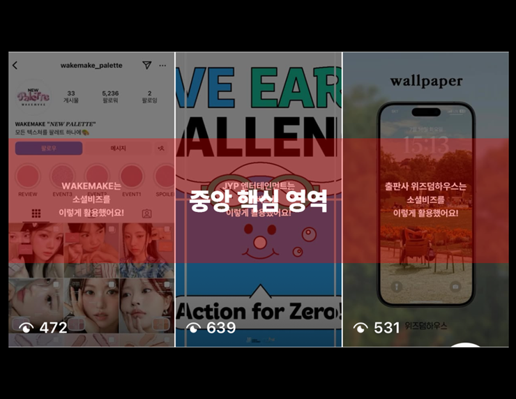 인스타그램 내 UI 요소에 영상의 내용이 가려지면 충분한 정보를 얻지 못하고 시선은 분산될 거예요. 시선은 안전 영역에 중앙에서 모든 것을 확인할 수 있게 해 가독성이 높아야 해요.
