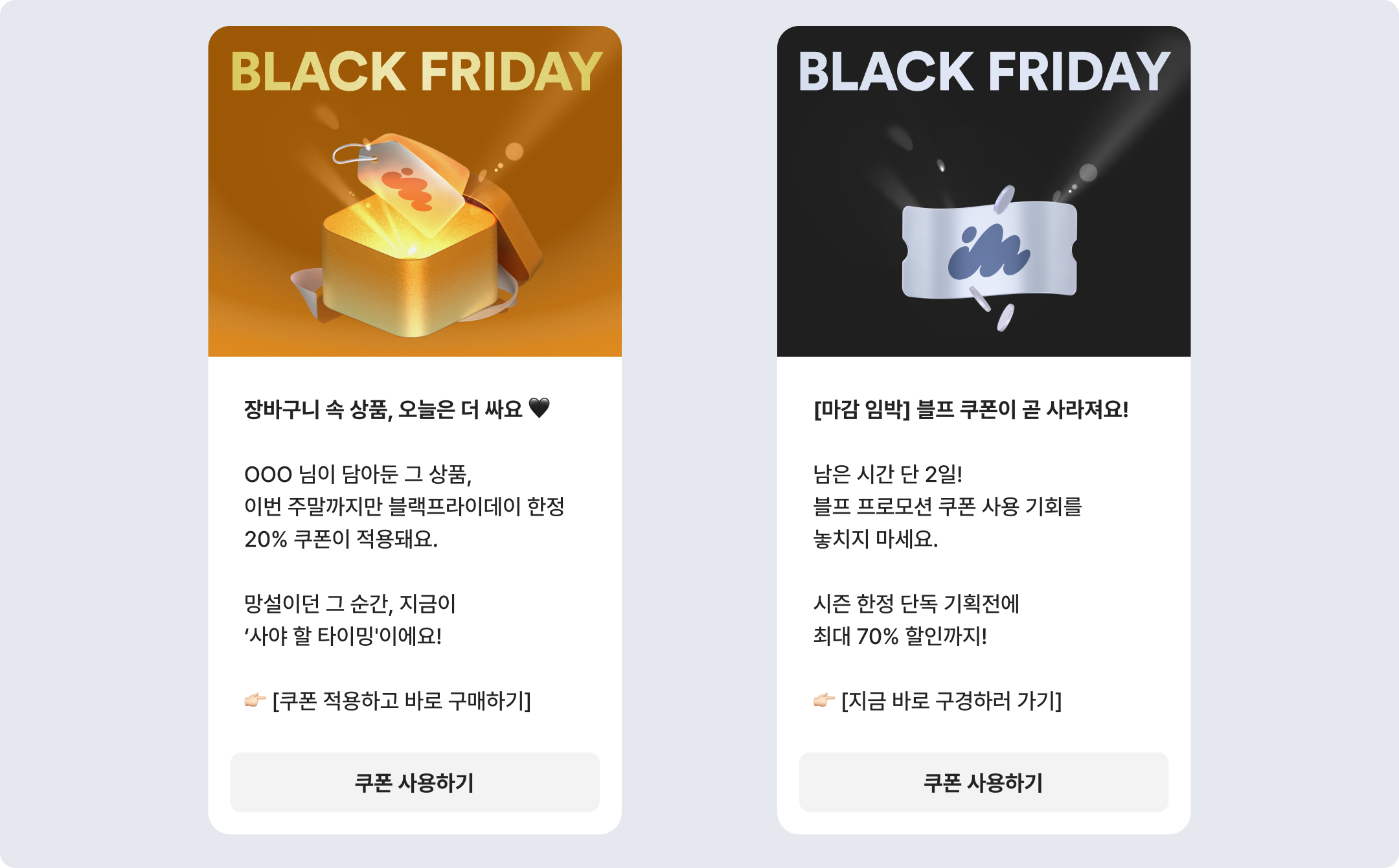 - 장바구니 이탈 고객에게 블랙프라이데이 한정 쿠폰 메시지 발송