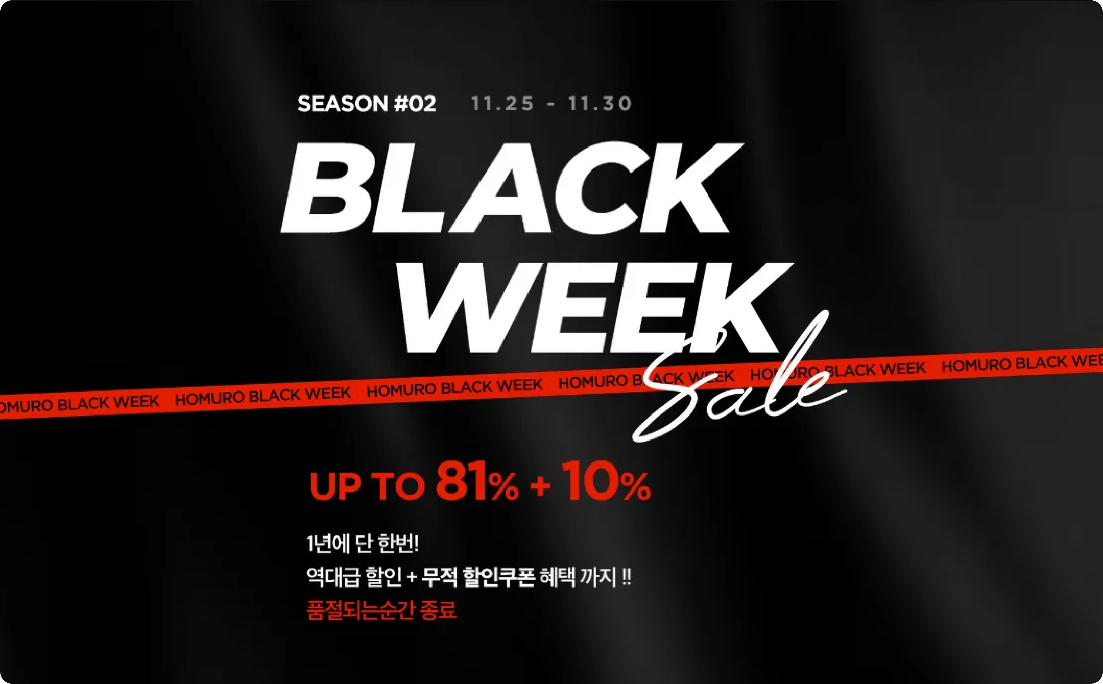 침구 브랜드 호무로 역시 블랙프라이데이를 잘 활용하고 있는데요. 특히 ‘1년에 단 한 번, 무적 할인 쿠폰' ‘품절되는 순간 종료’와 같은 긴박감을 주는 강렬한 표현이 인상적입니다.