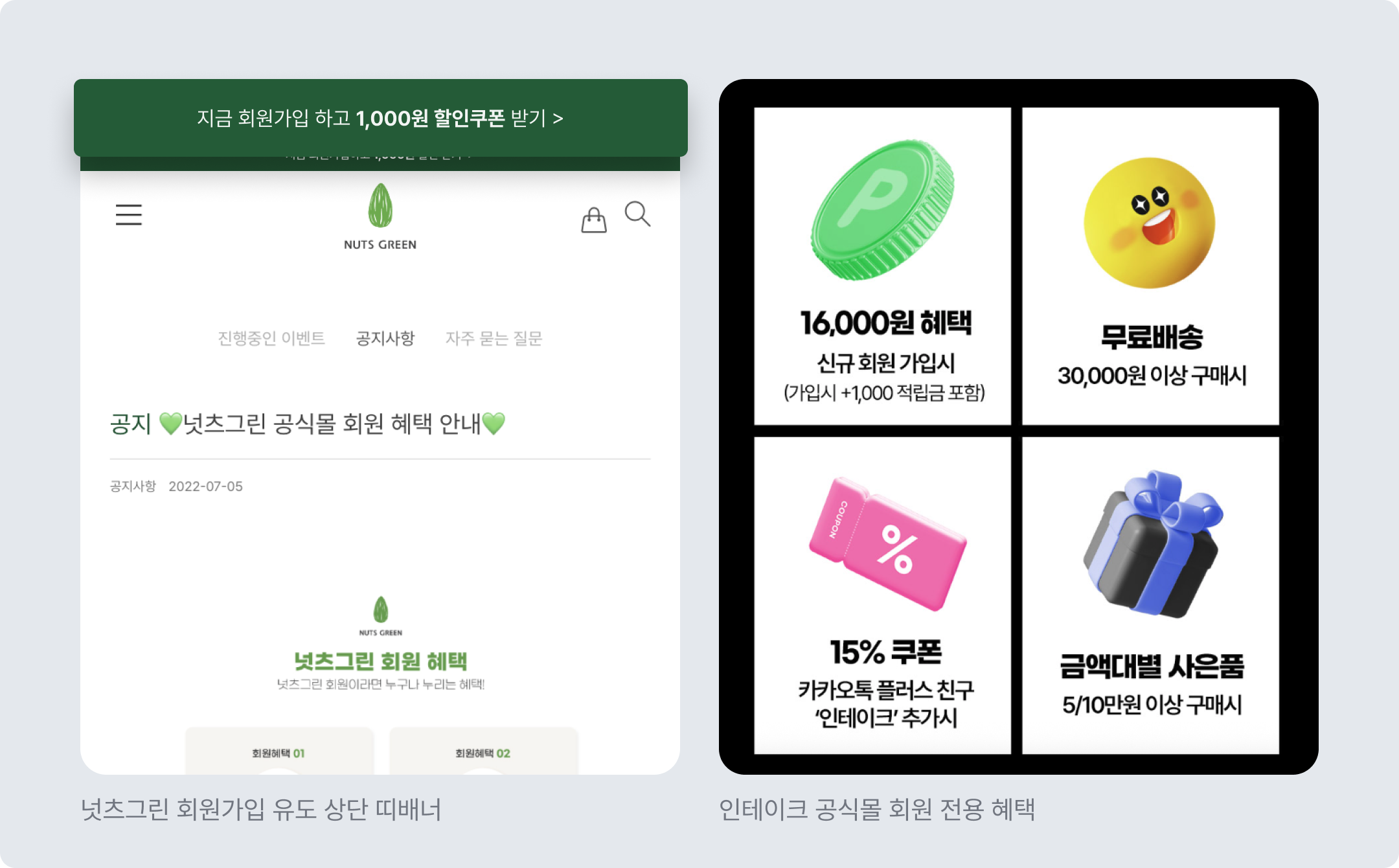 회원가입 버튼 말풍선이나 상단 띠배너를 통해 회원가입시에만 받을 수 있는 혜택을 드러낼 수 있고, 자사몰에서만 받을 수 있는 회원 혜택을 구성한 페이지를 만들어 두는 것도 좋은 방법이에요. 이러한 회원 전용 혜택은 블랙프라이데이와 같은 특정 시즌이 아니더라도 상시 활용이 가능합니다.
