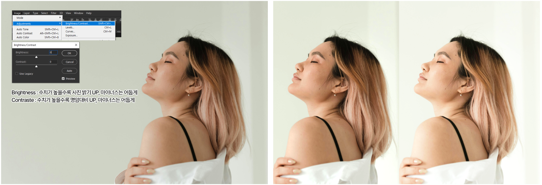 밝기를 올리고 대비를 낮추면 안정적인 톤이, 밝기를 올리고 대비를 높이면 쨍한 느낌이 납니다.