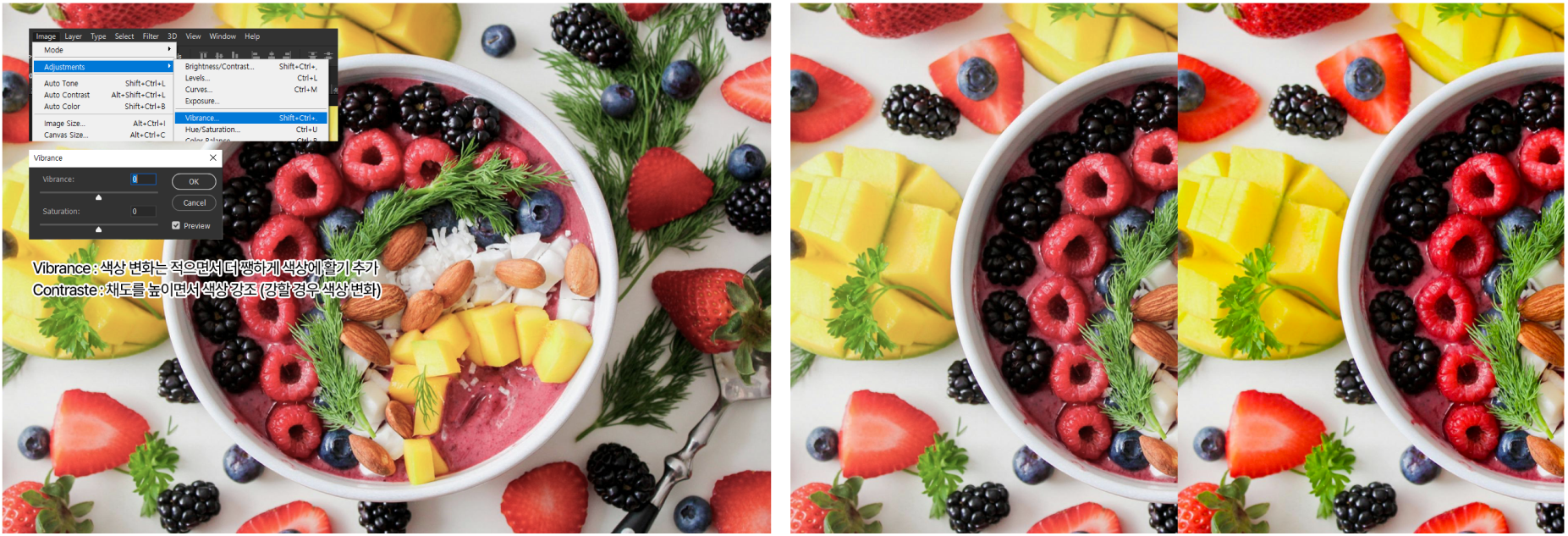 또한 어두운 사진을 밝힐 경우 전체적인 색감이 옅어지는 경우가 있는데, 이 경우에도 채도를 살짝 높여준다면 본래의 색상을 재현할 수 있습니다.