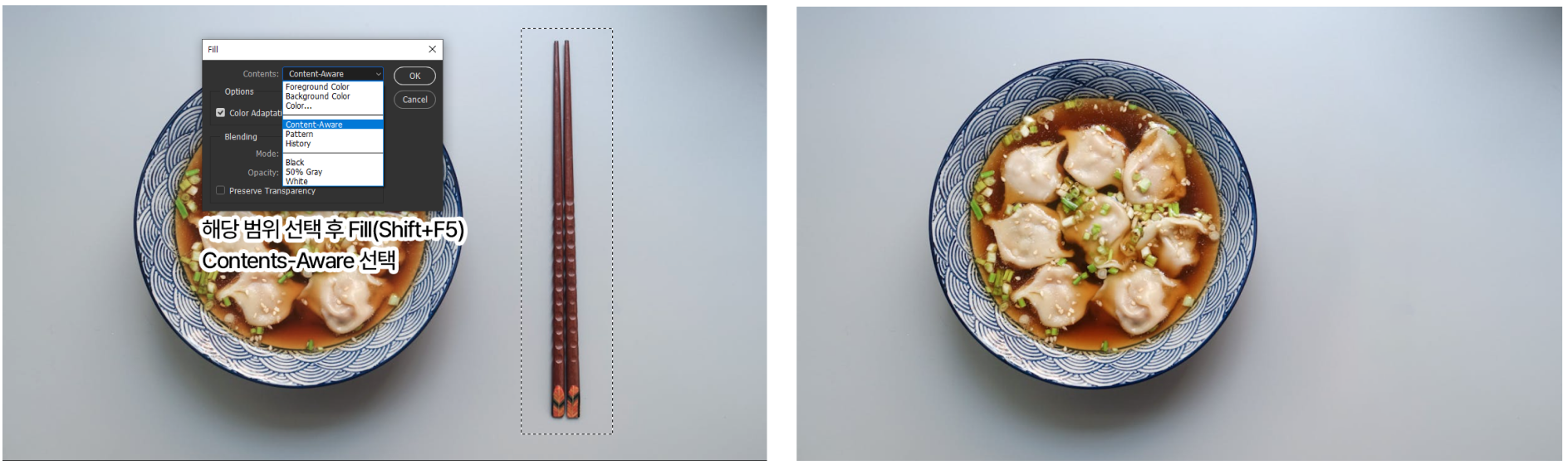 물론 완벽한 것은 아니므로 선택 범위가 단순하면서도 주변에서 가져올 수 있는 픽셀 소스가 많은 사진일 때 활용하는 것이 좋습니다.