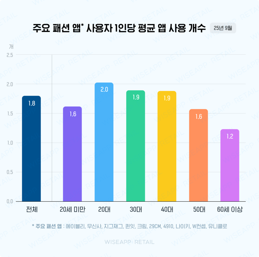 2025년 9월, 사용자 수 상위 10개 앱 기준으로 패션 앱을 사용하는 한국인은 1인당 평균 1.8개의 패션 앱을 이용하고 있는 것으로 나타났습니다. 연령대별로 살펴보면, 20대는 1인당 평균 2개, 3040대는 각각 1.9개를 사용하며 패션 앱을 가장 많이 사용하는 연령대로 조사됐어요.