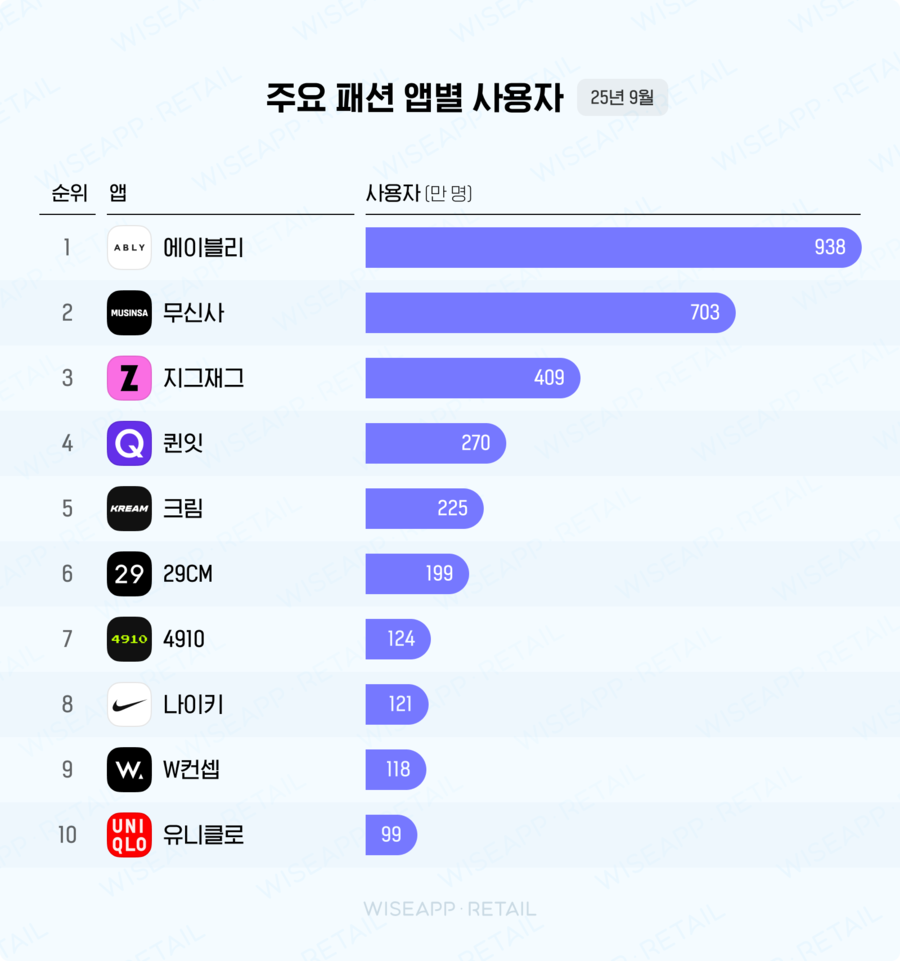 2025년 9월 기준 패션 앱 사용자 수 1위는 '에이블리'로 월간 평균 사용자 수(MAU) 938만 명을 기록했어요.