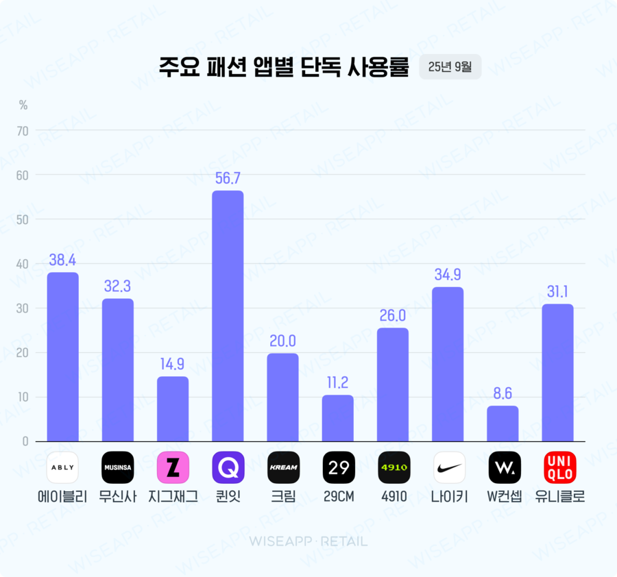 그 뒤를 이어 에이블리 38.4%, 나이키 34.9%, 무신사 32.3%, 유니클로 31.1%, 4910(사구일공) 26%, 크림 20%, 지그재그 14.9%, 29CM 11.2%, W컨셉 8.6% 순으로 집계됐어요.