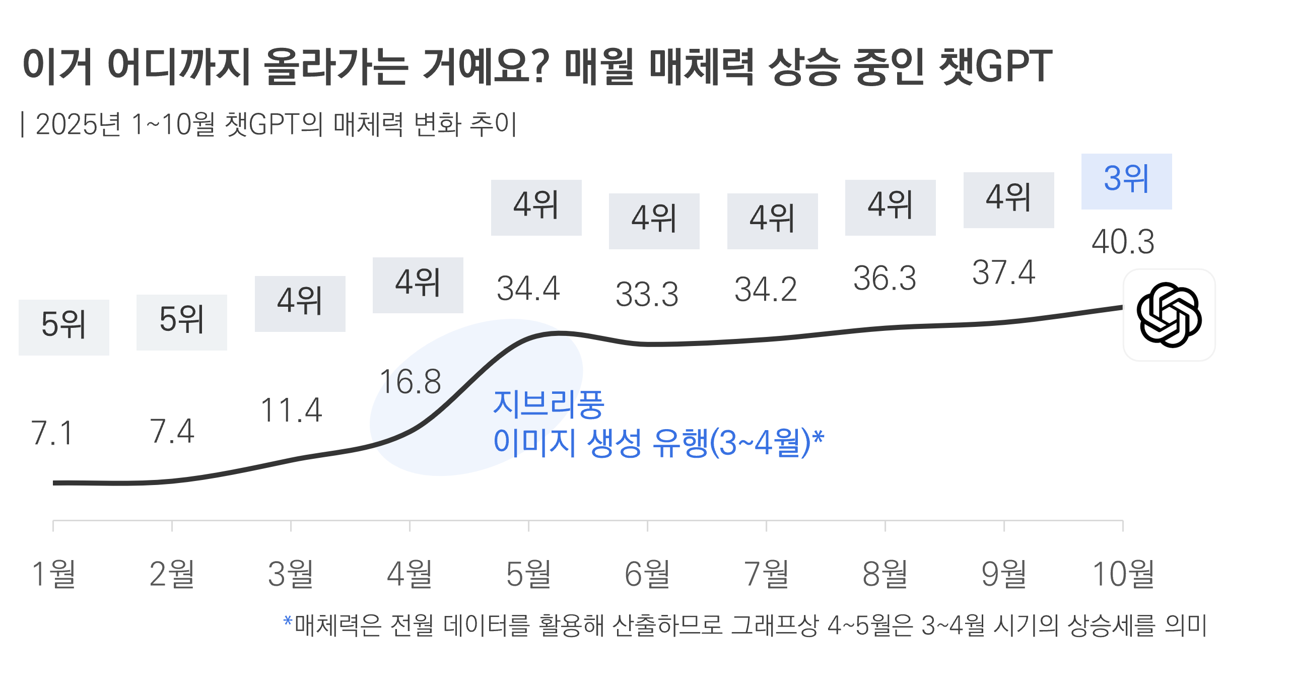 챗GPT의 매체력이 올해 들어 가파른 상승세를 이어가며, 10월에는 전월 대비 7.67% 증가해 전체 3위를 기록했어요. 3~4월 지브리풍 이미지 생성 열풍을 기점으로 급등한 뒤, 꾸준히 순위를 끌어올리며 결국 ‘다음’을 제쳤어요. 1월까지만 해도 5위였던 서비스가 10개월 만에 포털 3강 구도를 재편한 셈이에요.