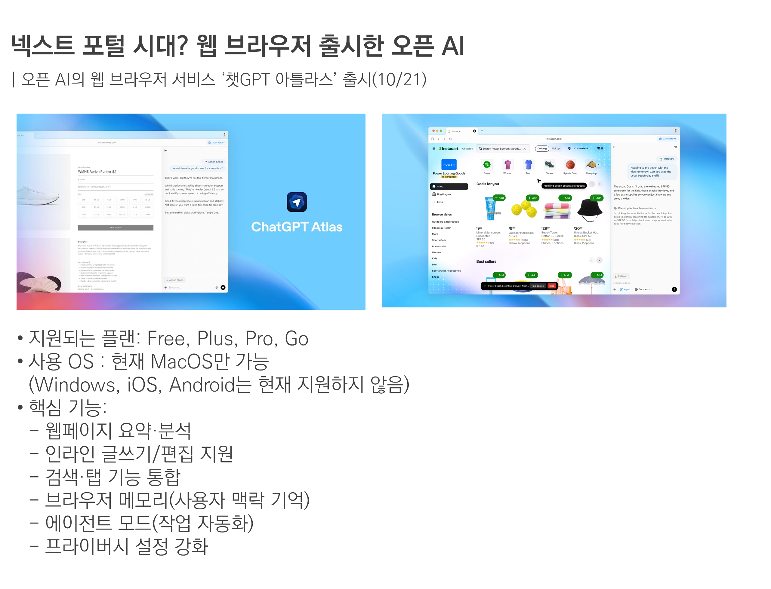 오픈AI는 지난 21일에, 웹 브라우저 서비스인 ‘ChatGPT 아틀라스(Atlas)’를 출시하며 AI 활용 범위를 넓혔어요. 이제 사용자는 대화창을 벗어나 웹페이지를 탐색하고, 검색 결과를 요약하거나 인라인으로 글을 작성할 수도 있어요. 특히 메모와 자동 요약, 브라우저 내 AI 도우미 기능 등으로 AI 검색의 지변을 넓혔어요. 단순 생성형 AI의 수준을 넘어, 사용자의 정보 탐색 습관 자체를 바꾸는 큰 변화가 예상돼요.