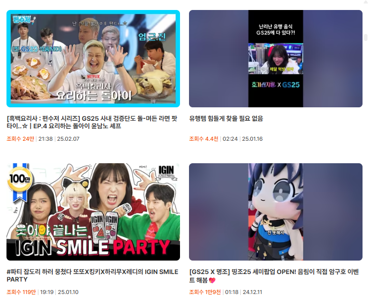 GS25 역시 ‘이리오너라’ 채널을 통해 ‘요리하는 돌아이’가 추천하는 편의점 레시피와 ‘궤도’와 함께 서울우유 빵에 대한 이야기를 재미있게 과학적으로 풀어 GS25의 상품을 중심으로 콘텐츠를 만들고 있죠.