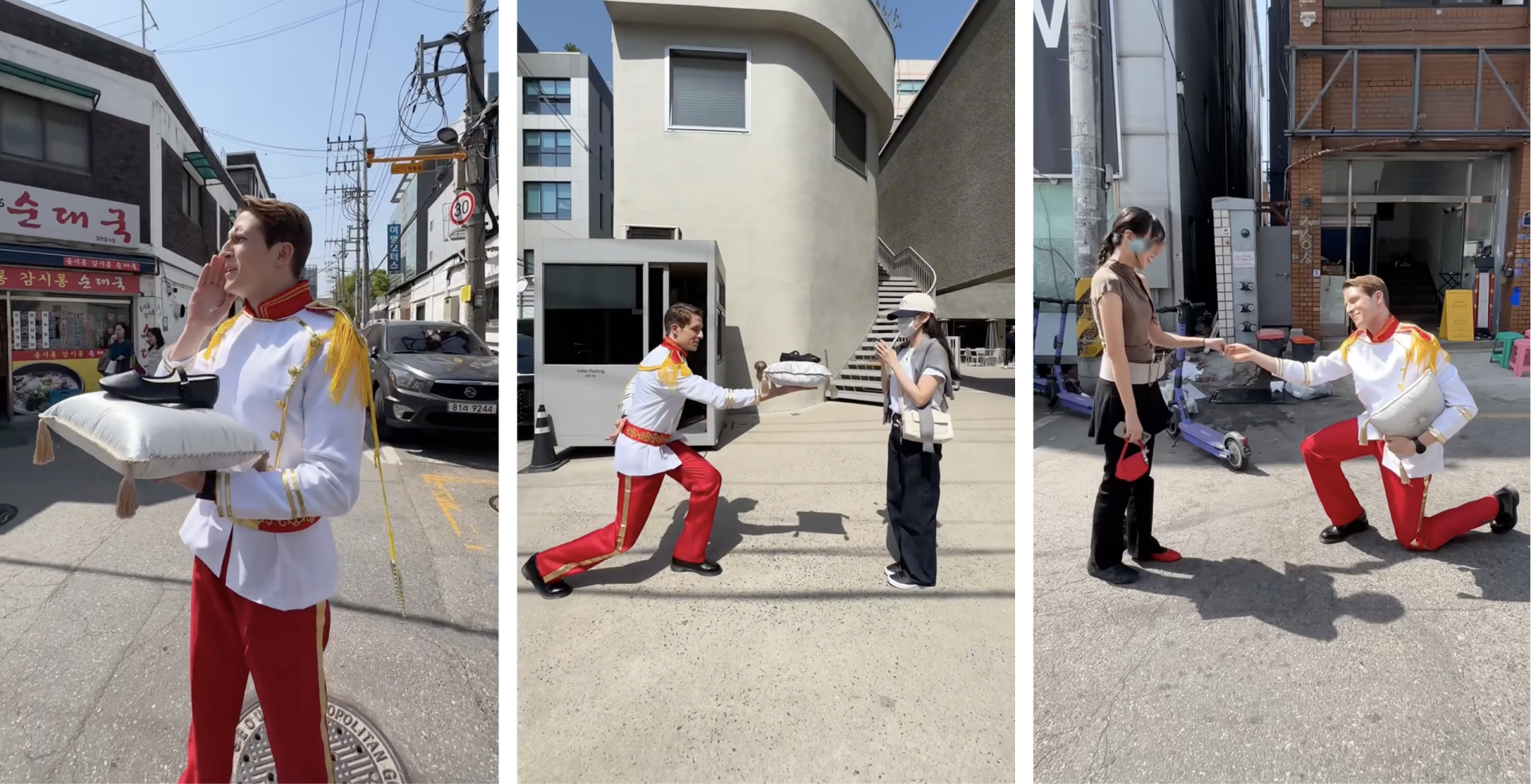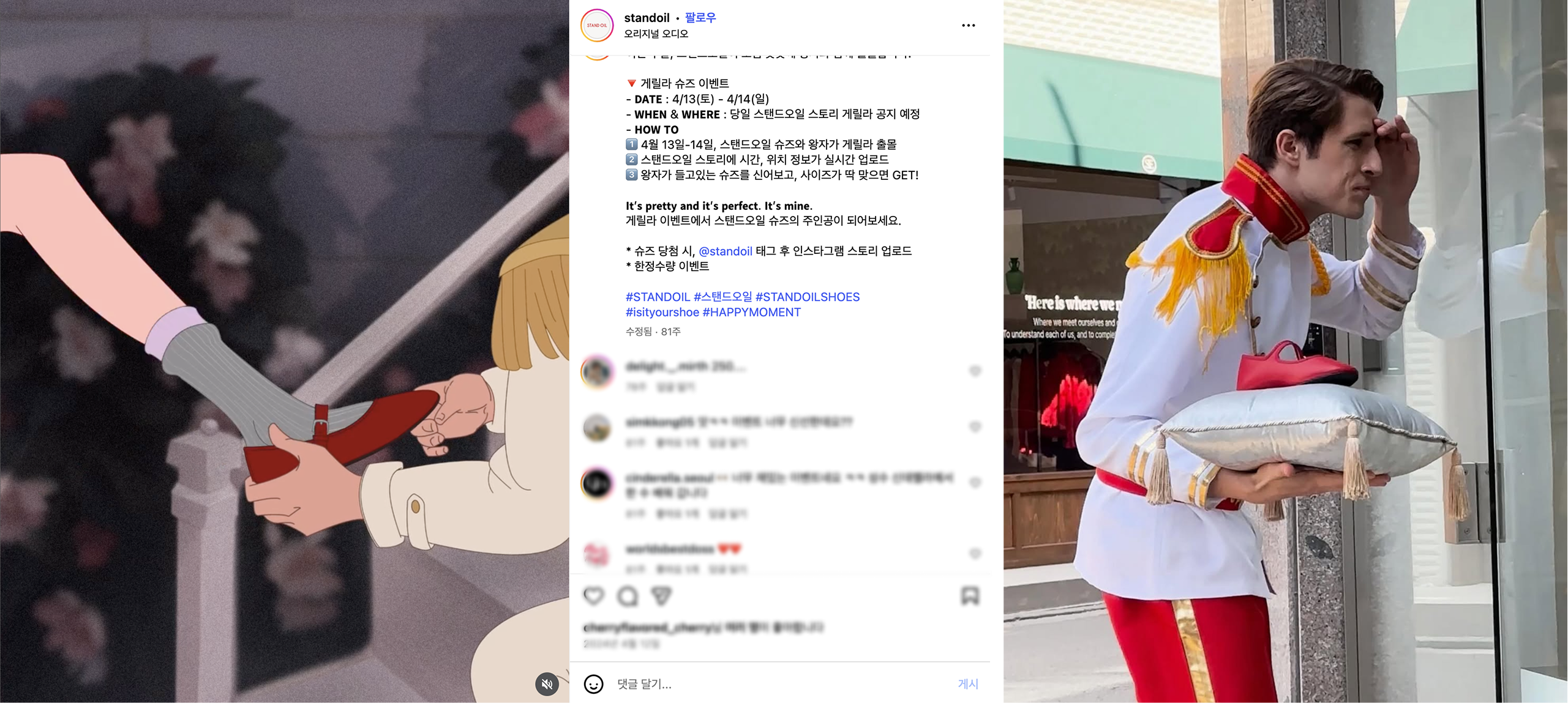 스탠드오일은 신제품 슈즈 컬렉션을 런칭을 기념해 기발한 게릴라 이벤트를 진행했어요. 잘생긴 왕자님이 서울 곳곳을 돌아다니며 신발 사이즈가 딱 맞는 ‘신데렐라’를 찾아 무료로 제품을 증정하는 행사였죠. 길거리에서 공주님을 찾듯 두리번거리는 모습, 사이즈가 맞는 사람 앞에선 무릎을 꿇고 청혼하듯 구두를 건네는 퍼포먼스까지. 지나가던 사람들도 발길을 멈추고 숨죽여 지켜볼 만큼 몰입감이 높았어요. 그리고 SNS에는 '왕자님 나타났다'는 글과 영상이 쏟아졌고요. 실제로 이 이벤트를 담은 영상은 20만 회가 넘는 조회수를 기록했다고 합니다.
