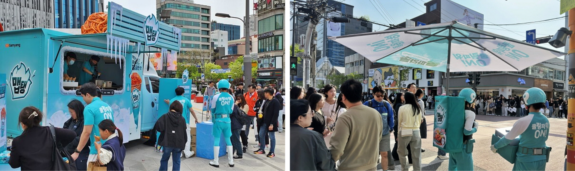 삼양의 진짜 승부수는 바로 '지구 방위대 후레시맵 요원단'이었어요. 전국 9개 도시에 맵탱 비빔면의 시원함을 직접 전달하는 콘셉트의 프로젝트로, 사람들에게 아이스크림 대신 맵탱 비빔면이 담긴 '쿨 비빔콘'을 나눠주고, 횡단보도 앞에는 시원한 그늘을 만들어주는 '쿨파라솔' 게릴라 이벤트를 진행했어요. 소비자들은 “이게 뭐야?” 하며 관심을 갖으며 그 순간 브랜드가 말하고자 한 ‘시원함’을 바로 체감했어요.