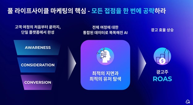따라서 단순히 앱 설치나 리타겟팅 같은 특정 단계에 집중할 것이 아니라, 인지(Awareness) → 고려(Consideration) → 전환(Conversion)에 이르는 고객 여정 전반을 정교하게 설계하고 유저와 연결하는 통합 전략이 필수입니다.
