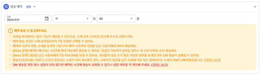 발송 예약 기능은 댓글을 남긴 유저에게 즉시 DM을 보내지 않고 7일 이내 날짜를 30분 단위로 설정해 원하는 날짜에 DM을 보낼 수 있어요. 미리 예비 고객을 확보해 고객수를 확인해서 상품 재고를 체크하고, 웨비나 같은 경우 최대 접속자 등을 미리 파악해 둘 수 있어요. 특히 이러한 발송 예약 기능으로 고객을 미리 확보해 놓기 때문에 이벤트나 공동구매 같은 프로모션의 성공률이 높아질 수 있어요.
