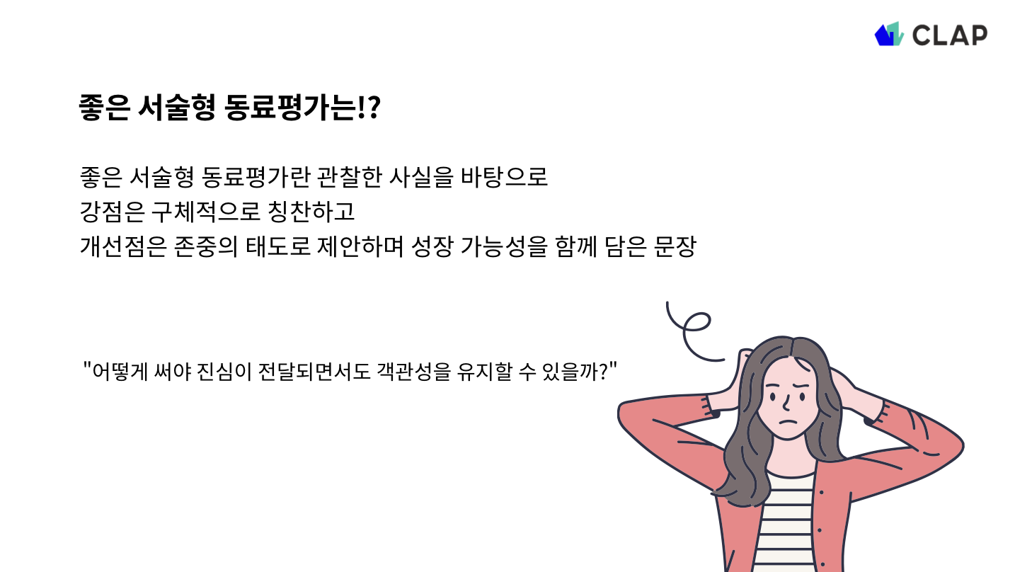 이 글의 원문은 CLAP팀 블로그 동료평가 어렵지 않아요! 서술형 문구 예시부터 항목별 작성 가이드까지에서 확인할 수 있습니다.