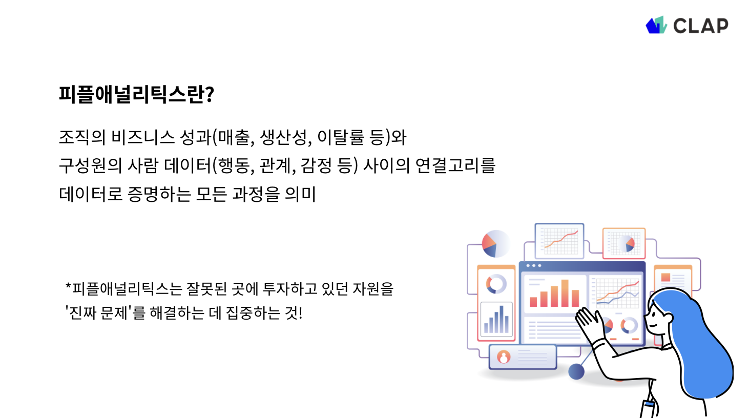 피플애널리틱스란, 조직의 비즈니스 성과(매출, 생산성, 이탈률 등)와 구성원의 사람 데이터(행동, 관계, 감정 등) 사이의 연결고리를 데이터로 증명하는 모든 과정을 의미합니다.