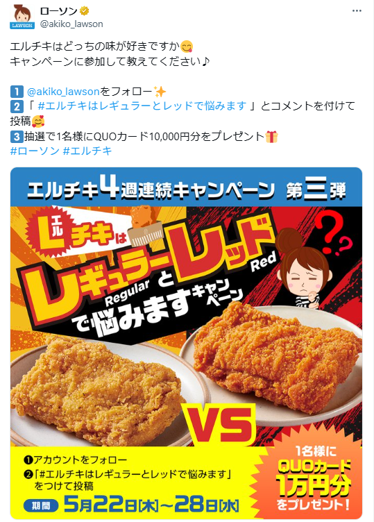 일본 3대 편의점 중 하나인 로손의 공식X는 2025년 5월 스테디셀러 상품인 ‘L치킨’ 캠페인을 진행했습니다. ‘L치킨 레귤러와 레드중 어느쪽? (エルチキはレギュラーとレッドで悩みます)’라는 해시태그를 사용하여 유저들에게 어떤 맛을 더 선호하는지 투표하게 하는 기획을 진행했습니다.
