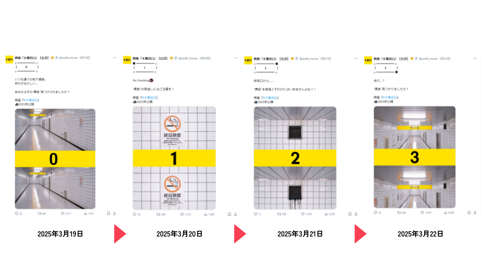 통상적으로 영화나 엔터테인먼트 작품의 개봉 전 프로모션에서는 "D-DAY까지 n일"과 같은 '카운트다운' 형식이 일반적입니다. 하지만 2025년 8월 29일 개봉한 영화 [8번 출구]는 원작인 게임의 특징을 살려, 색다른 "카운트 업" 티저 기획을 전개했습니다.