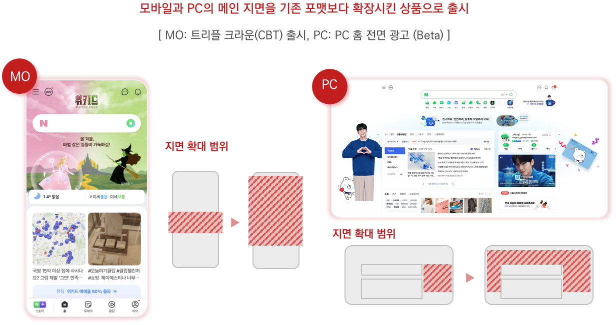 네이버는 모바일과 PC 메인 화면에서 기존 대비 가용 지면을 최대한 확보하는 방식으로 광고 영역을 넓혔어요.