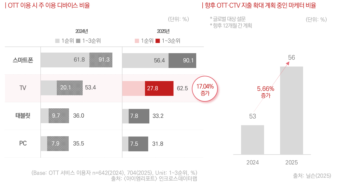 OTT에서의 이용자 역시 TV 시청 비중이 전년 대비 17.04% 증가하면서 브랜드들은 OTT·CTV 예산을 강화하고 있어요.