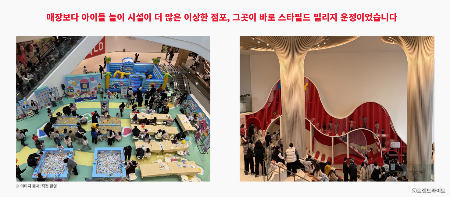 국내 오프라인 리테일이 ‘쇼핑 중심’에서 ‘쇼핑+여가’로 옮겨왔다면, 스타필드 빌리지는 한 발 더 나가 ‘여가를 중심에 두고 쇼핑이 따라오는’ 모델을 보여줍니다.