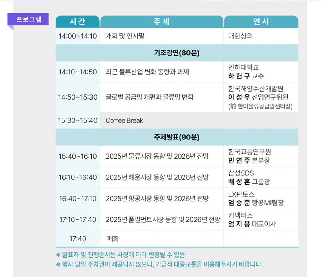 <2026 물류시장 전망 세미나> 타임테이블. 쟁쟁한 분들 사이에 삐죽 이름을 비추니 참 어색하고 좋군요. ⓒ대한상의