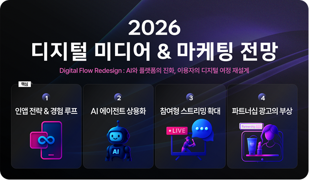 2026년은 디지털 탐색 방식과 이용자 행태가 다시 정의되는 전환점으로 전망됩니다. 플랫폼은 서비스 간 이동을 최소화하고 앱 안에서 발견–탐색–참여–전환이 순환되는 구조를 강화하며 ‘인앱 전략 & 경험 루프’를 핵심 경쟁력으로 삼고 있습니다.