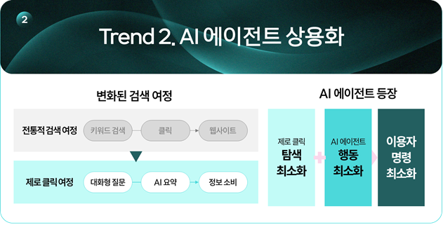 기존의 검색·탐색 방식이 크게 변하고 있습니다. 검색창에 직접 입력하고 클릭하던 흐름에서 벗어나, AI가 탐색·판단·실행을 대신해주는 ‘제로 클릭(Zero Click)’ 시대가 본격화되고 있어요. 이에 따라 ‘AI 에이전트’를 활용한 서비스가 이커머스와 광고 영역 전반에 빠르게 확산되고 있습니다.