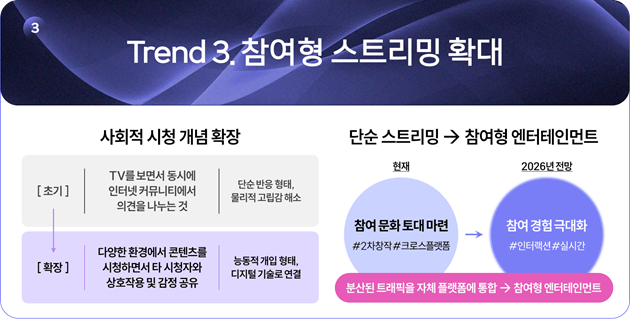 2026년 OTT·동영상 플랫폼은 참여형 엔터테인먼트 경험이 핵심 경쟁력으로 자리 잡을 것입니다. 이에 따라 콘텐츠의 몰입도가 증대되며 광고의 프리미엄 가치 역시 더욱 높아질 전망입니다.