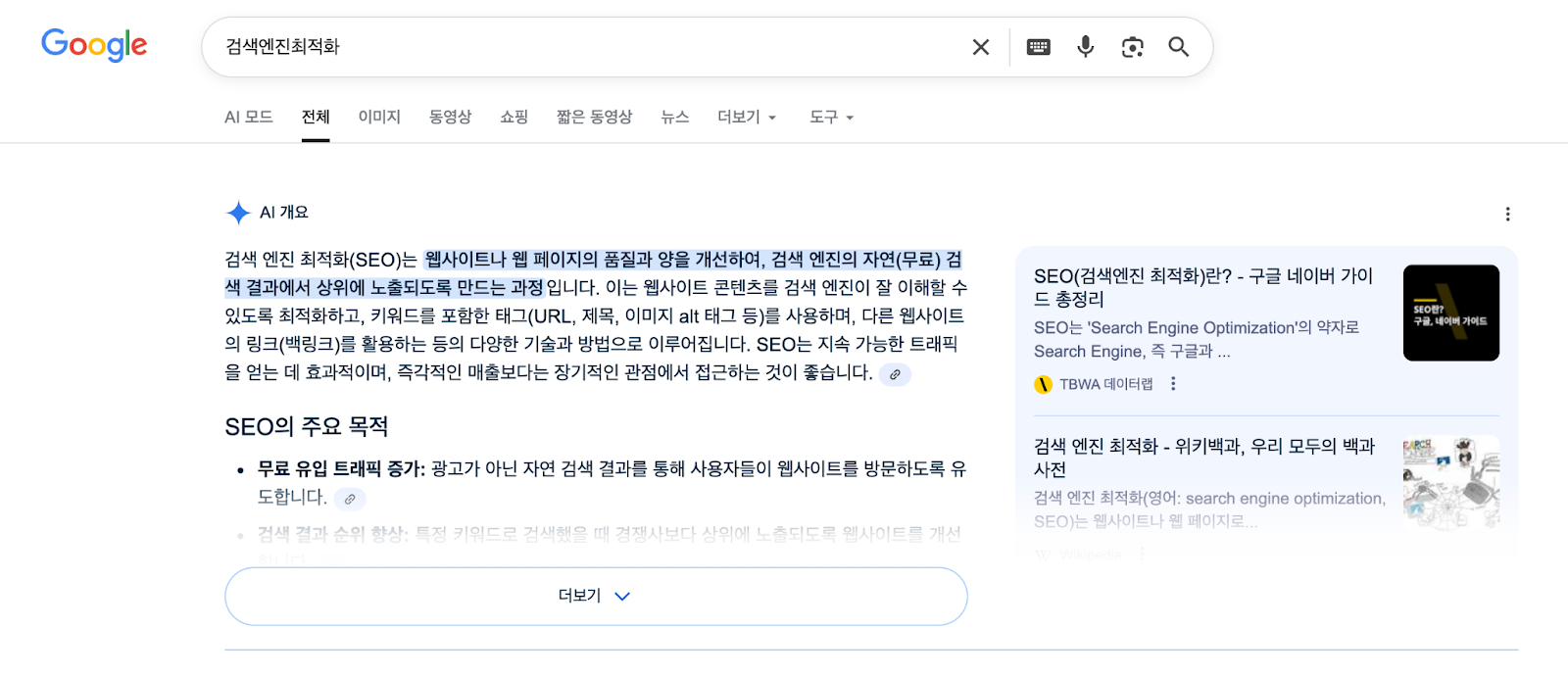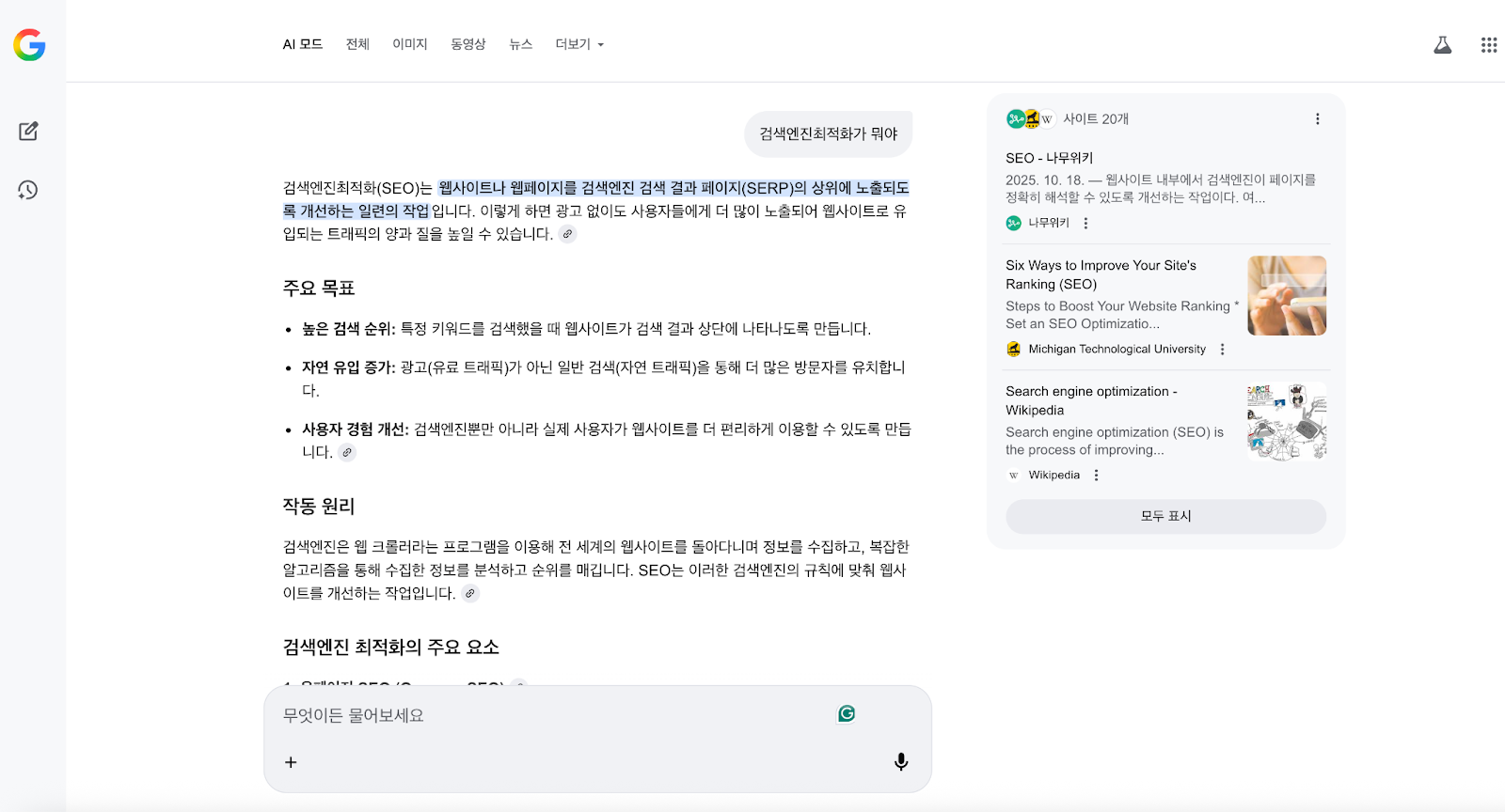 AI 개요 및 AI 모드에서의 노출을 위한 최적화 권장 사항은 다음과 같습니다.
