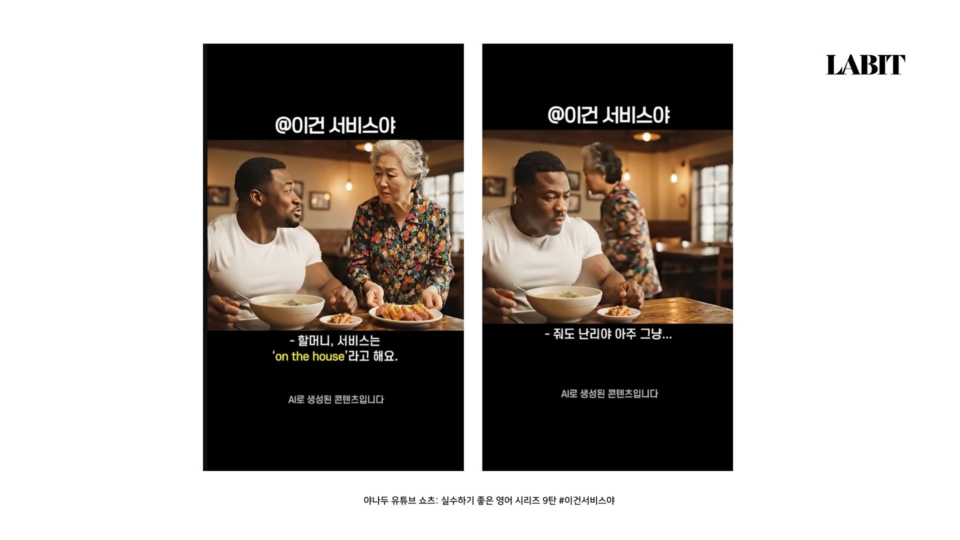 야나두는 <실수하기 좋은 영어시리즈>라는 제목을 단 100% AI로 제작한 숏폼 시리즈를 선보였습니다. 최근에는 <김영감의 여사친>이라는 시리즈도 등장했죠. 이 영상들의 설정은 단순하지만 기발했어요. 인상 좋은 흑인 남성과 영어가 서툰 한국인 할머니·할아버지가 등장해 일상에서 일어날 수 있는 일들을 유쾌한 상황극으로 풀어냈거든요. 가장 조회 수가 높은 영상은 #이건 서비스야 라는 표현을 알려주는 영상인데요, 가게에서 음식을 내주며 “This is service(이건 서비스야)”라고 말하는 할머니에게 흑인 남성이 “할머니, 서비스는 on the house라고 해요.”라고 표현을 알려주는 식입니다. 유명한 배우도 화려한 로케이션도 없이 오직 AI로 생성된 캐릭터들이 짧은 상황극을 펼치는 게 다죠.